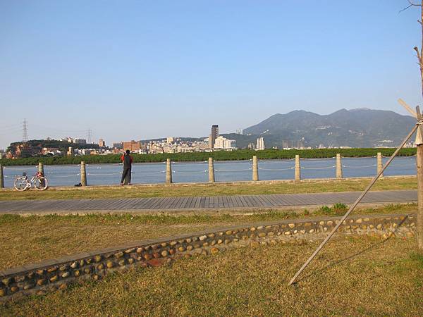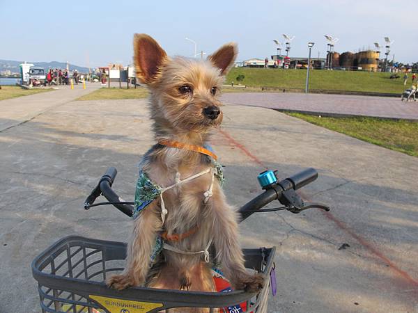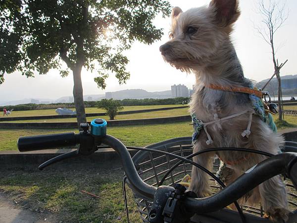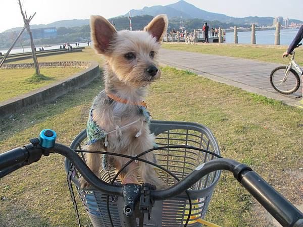 今天天氣很好,帶狗狗出去騎腳踏車踏青。
