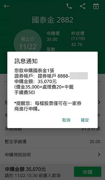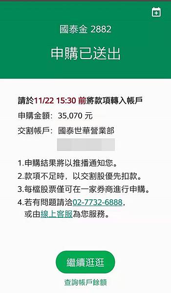 國泰證券需要在申購截止日當天15:30確認帳戶有錢,才算有效