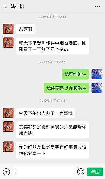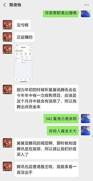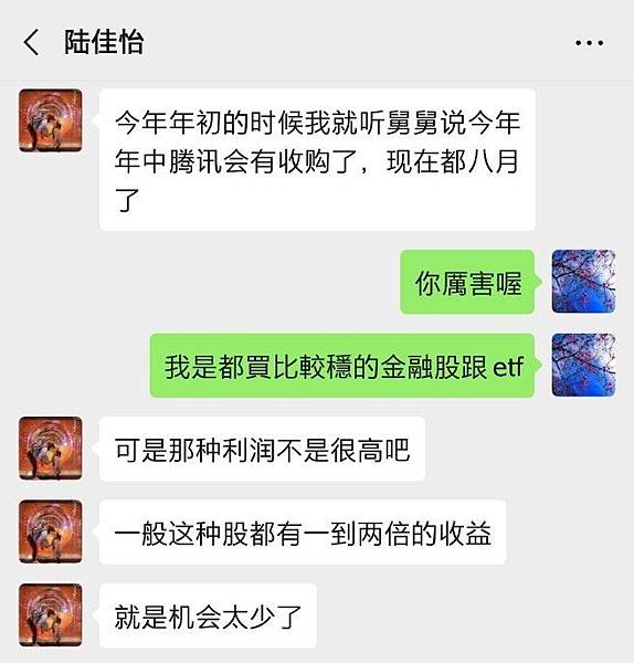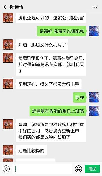 在台灣存股社團認識一位對岸單親媽媽美魔女加我微信,好奇就加了(目前帳戶已經消失)