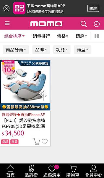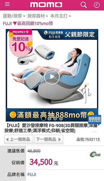 因為很喜歡按摩,買了林依晨擔任代言按摩椅,MOMO價格34500,回饋MOMO幣3450