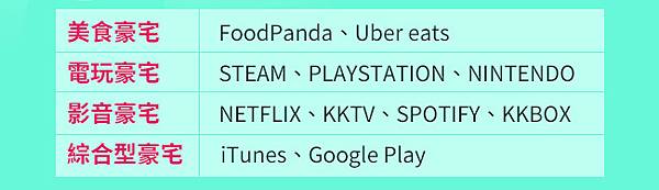 foodpanda、Uber Eats、Steam、PlayStation、Nintendo、Netflix、CATCHPLAY、