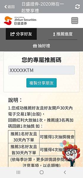 1. 好友至活動頁輸入推薦碼並開立證券電子戶成功,30天內電子下單滿10萬回饋好友300點。