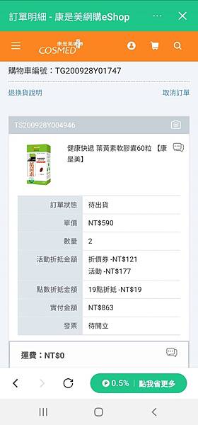 NT$863(已折抵: 網購折價券 -NT$121 、 2件85折活動折抵 -NT$177 、 點數折抵 -NT$19 )